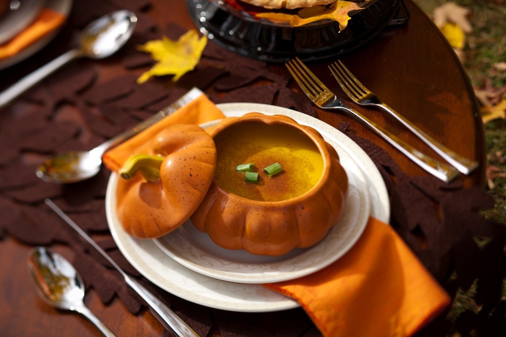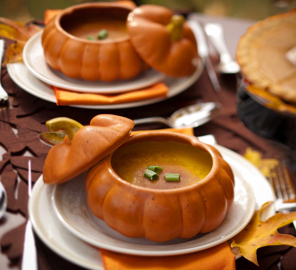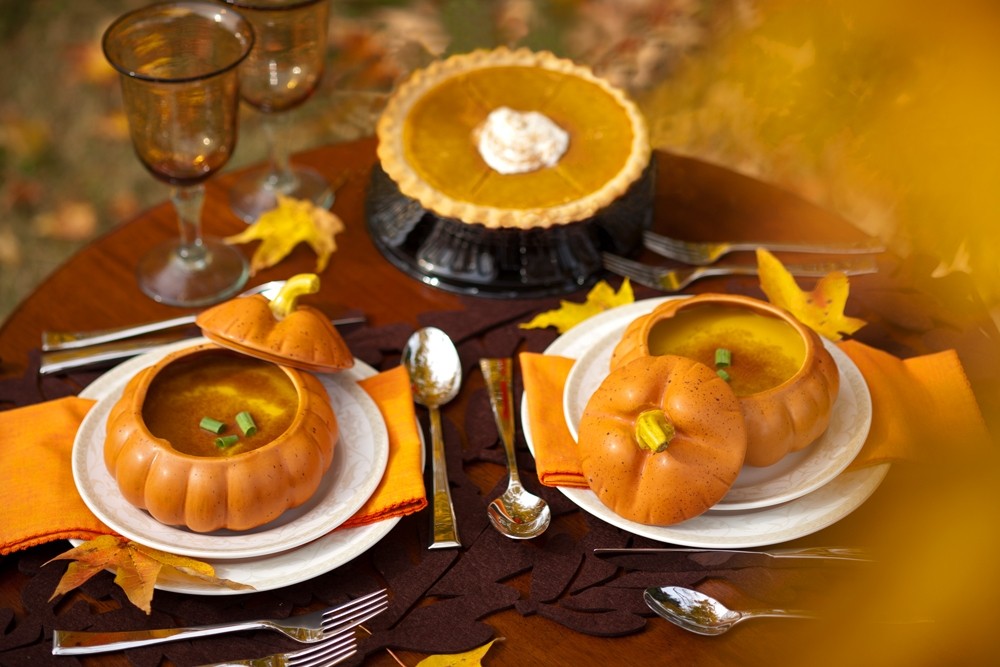 Our beautiful dinnerware Antoinette from the Dinner4Two Collection by Kitchen Charm sits atop the brown cut out leaf table runner from Molbachs. This is accented by the charming individual pumpkin tureens from Williams Sonoma along with the pumpkin colored napkins from Pier1 to add an addition splash of color. Cairo flatware adds is the supporting role that completes this tablescape.
