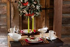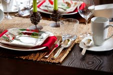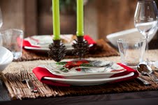 The natural Raffia fiber table runner from Pottery Barn is the right contrast to begin building this tablescape. The acorn candle holders bring a charm and warmth to the table and are from Pottery Barn as well. The twig placemats are from Pier 1 and the decorative poinsettia and cardinal plates are from TJ Maxx Home Goods. The red napkins add the right touch of color that pulls all the elements together to create this Cozy Cabin Christmas table.